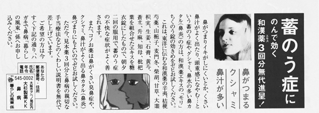 インターネット検索に頼ると、「『モリ』ちくのう錠」の広告ファン(?)的な情報は、2、3点探すことができた。しかし、あの写真の女性の正体については、まったく謎。客観的に広告を見れば、ちくのう症とあの女性とはなんの因果もなさそうだ。しかし、私としては、あの謎の金髪女性が頭から離れない。