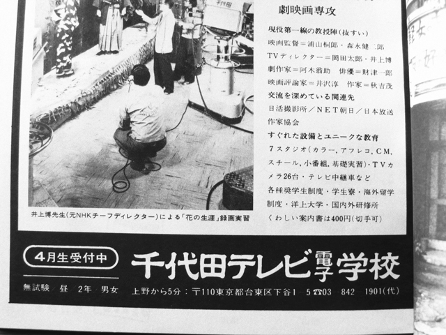 古い雑誌などを必要に応じて収集している際、偶然ながら「千代田工科芸術専門学校」の広告に目が止まる。少なくともこうした広告で学校名を覚え、高校の進路指導の分厚い資料で改めて学校の情報を得る――というようなかたちを経て私はここを入学したことになる。